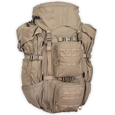 Lots of MOLLE options to add stuff to the outside. Comfortable yolk-style harness. Reinforced webbing and stitching throughout. Water repellent. Hydration pouch.